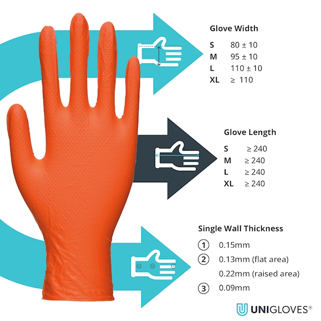 Oranger, äusserst dickwandiger (0,13 mm) und stabiler Nitril-Handschuh für hohe mechanische Ansprüche. Latex- und puderfrei.