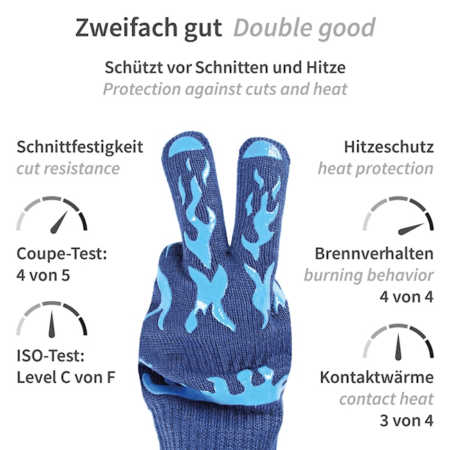 Le revêtement extérieur en aramide et silicone assure une prise en main sûre, même sur des matériaux lisses ou chauds. La matière douce en polyester-coton offre un confort agréable et est idéale pour les utilisations prolongées dans la transformation des aliments, la pâtisserie, les grillades ou l'industrie. Le gant est lavable en machine, conserve sa forme et sa fonctionnalité, même après de nombreux lavages. Peut être porté des deux mains.