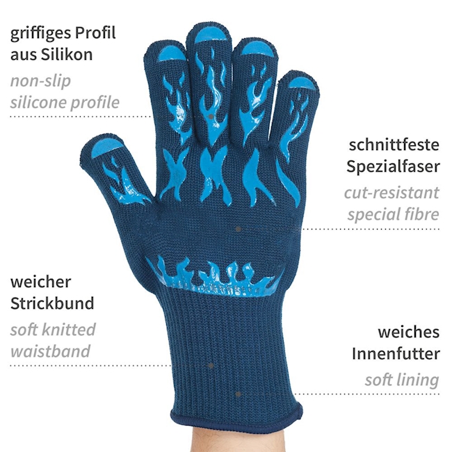 - Revêtement en aramide et silicone pour une prise en main sûre sur les matériaux lisses ou chauds