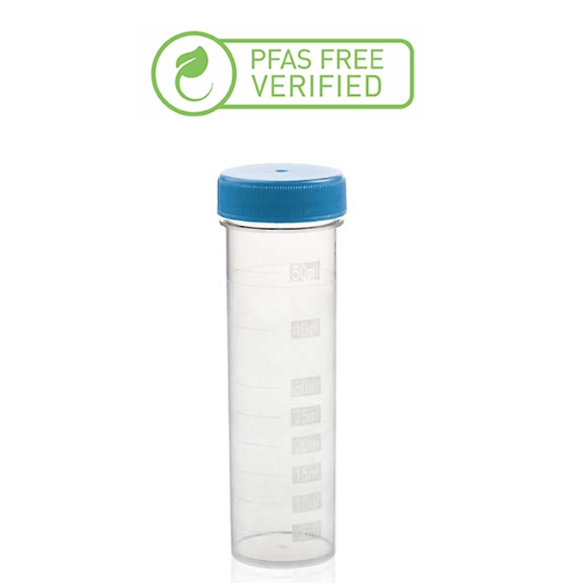 Provette autoportanti a fondo piatto a tenuta stagna. Realizzate in polipropilene (PP) altamente trasparente. Dotate di tappo a vite blu a chiusura ermetica. Con scala graduata stampata da 5 a 50 ml con incrementi di 5 ml.