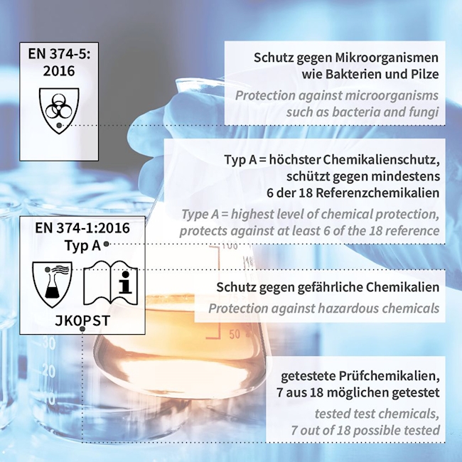 Incontra i requisiti di: CE 2777 Regolamento DPI (UE) 2016-425; CAT 3 - Dispositivo di protezione individuale di categoria 3; EN ISO 21420:2020; EN 374-5:2016 VIRUS - Guanti di protezione contro sostanze chimiche e microrganismi pericolosi; EN ISO 374-1:2016 Tipo A KTPSJO; MD - Dispositivo medico secondo il Regolamento (UE) 2017/745; EN 455 1-4 - Guanti per uso medico; AQL 1,5 - Livello di qualità accettato; Adatto al contatto con gli alimenti