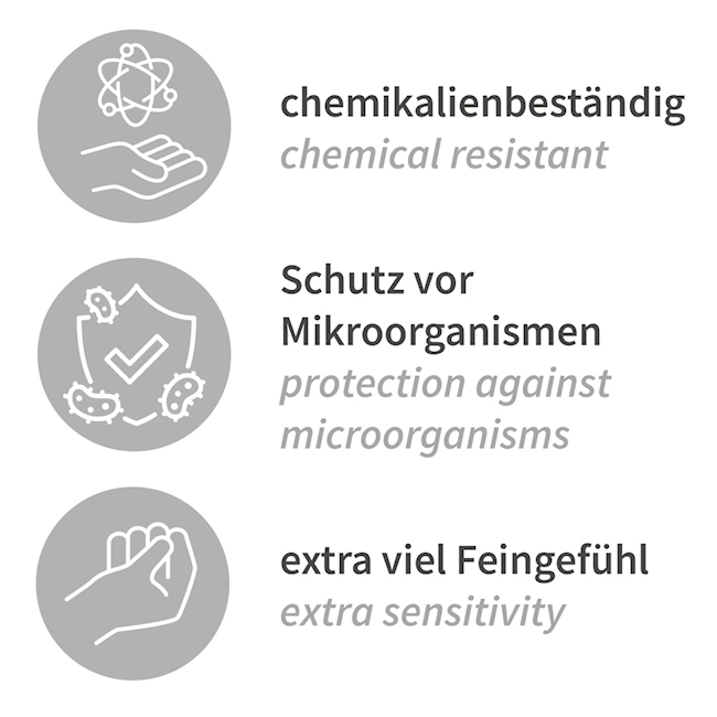 Guanti protettivi contro schizzi di sostanze chimiche e liquidi: il guanto in nitrile SUPER HIGH RISK protegge da schizzi di sostanze chimiche, detergenti e altri liquidi. Offre un comfort eccellente e la massima flessibilità per lavorare in sicurezza con i liquidi. Questo guanto in nitrile è inoltre estremamente resistente allo strappo, leggero e comodo da indossare tutto il giorno. Campi di applicazione: laboratorio, industria, lavori di montaggio leggeri, lavorazione alimentare, lavori di pulizia, lavori generali con liquidi.